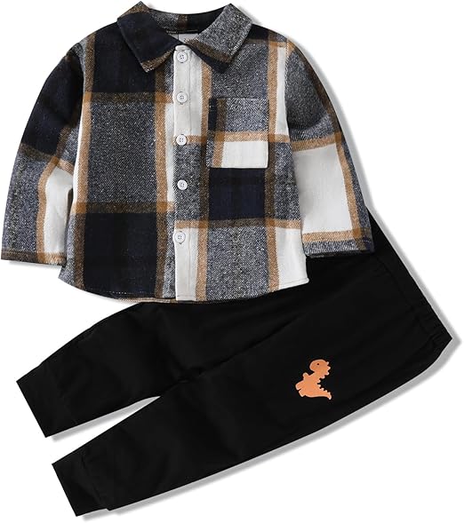 Toddler Boy Clothes Checkered Plaid Flannel Shirt + Dinosaurs Print Pants 2 Pieces Boys Fall Winter Outfits Set(2-3T)