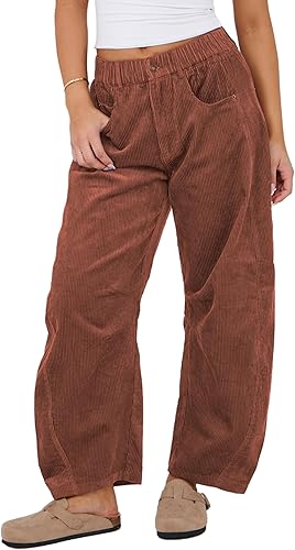 Women's Corduroy Pants Barrel Mid-Rise Elastic Waist Cord Pants Casual Wide Leg Baggy Trouser with Pockets