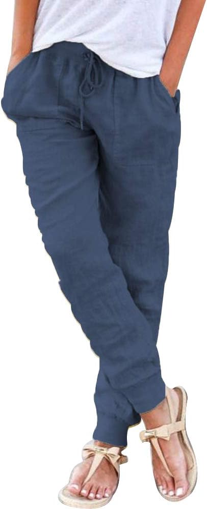 Womens Tapered Pants Cotton Linen Drawstring Back Elastic Waist Pants Casual Trousers with Pockets